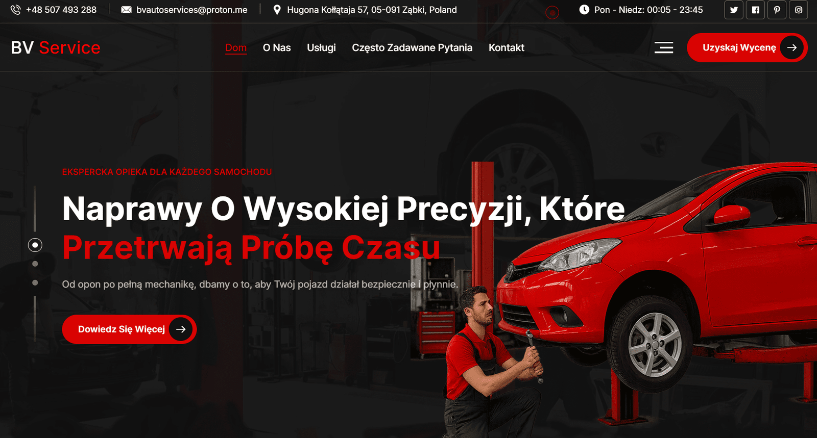 BV Service, an automotive service business located at Hugona Kołłątaja 57, 05-091 Ząbki, Poland, partnered with UseCodify to build a clear and professional multi-page landing website in Polish only. The goal was to present services clearly, answer common customer questions, and provide reliable ways for customers to get in touch and subscribe to updates.