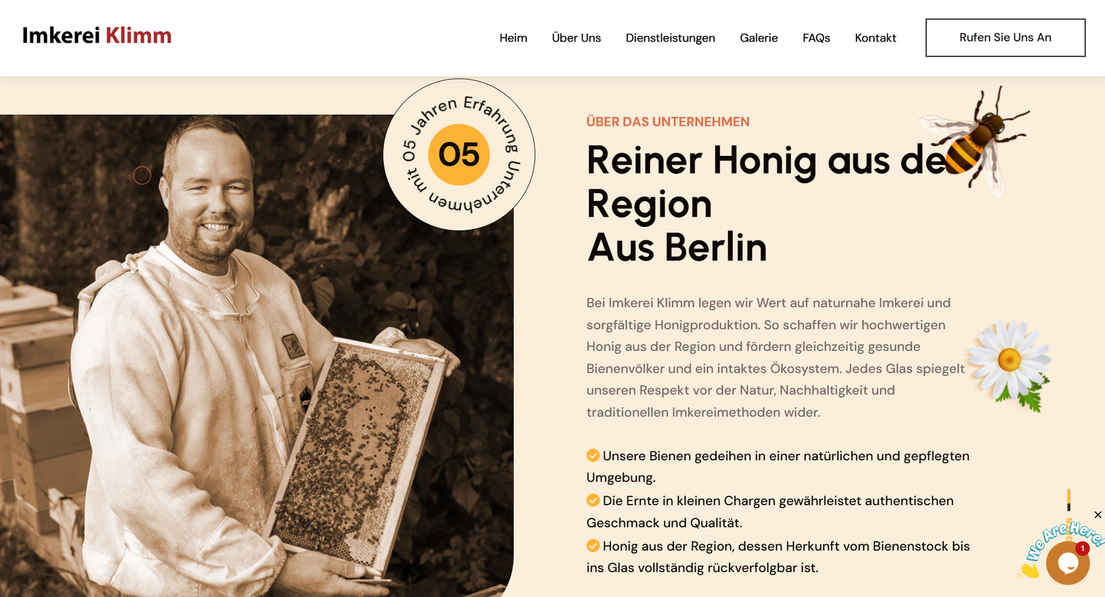 Imkerei Klimm, located at Minorkaweg 16A, 12355 Berlin, Germany, partnered with UseCodify to build a clean and professional multi page landing website in German only. The objective was to present their beekeeping services clearly, showcase their products and process visually, and provide easy communication through live chat, map integration, and a German contact form.